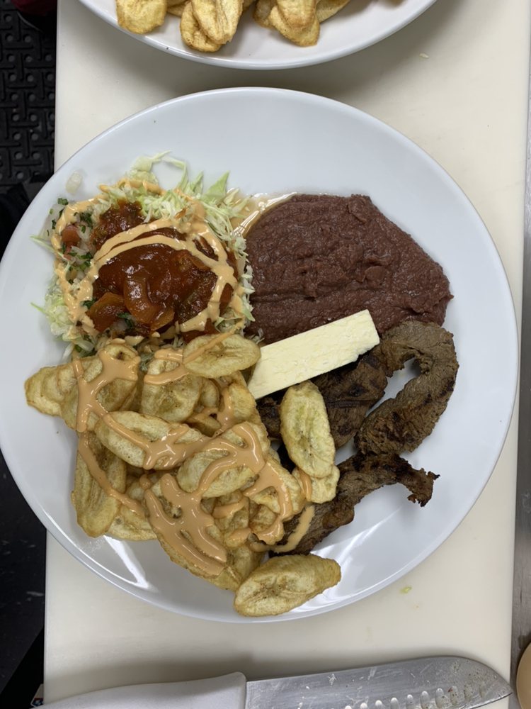 Carne Asada with Tajadas, cabbage, pico, aderezo, salsina, and pickled onions.