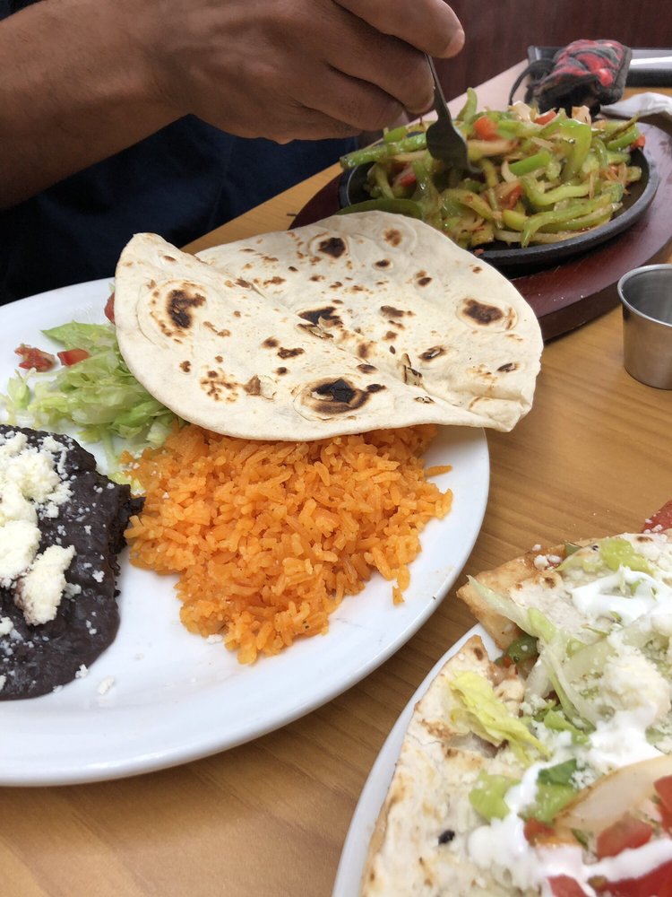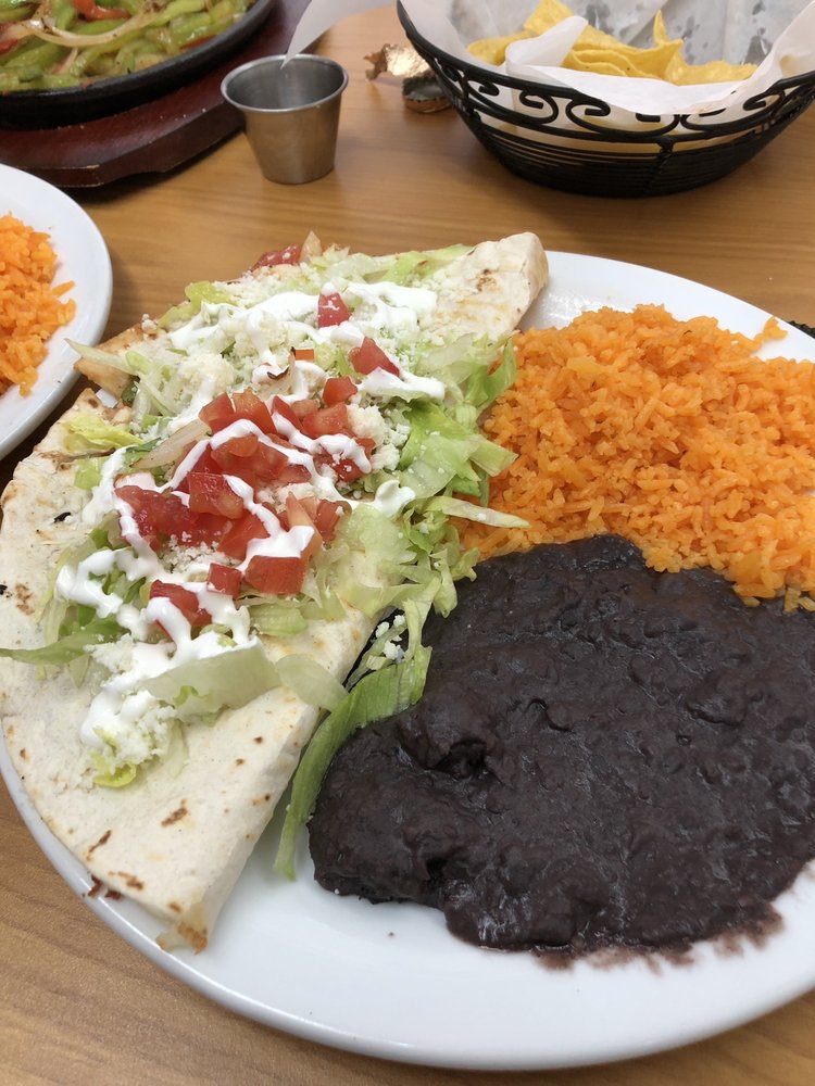 Flour tortillas filled with cheese and your choice of meat and a side of pinto beans and rice.