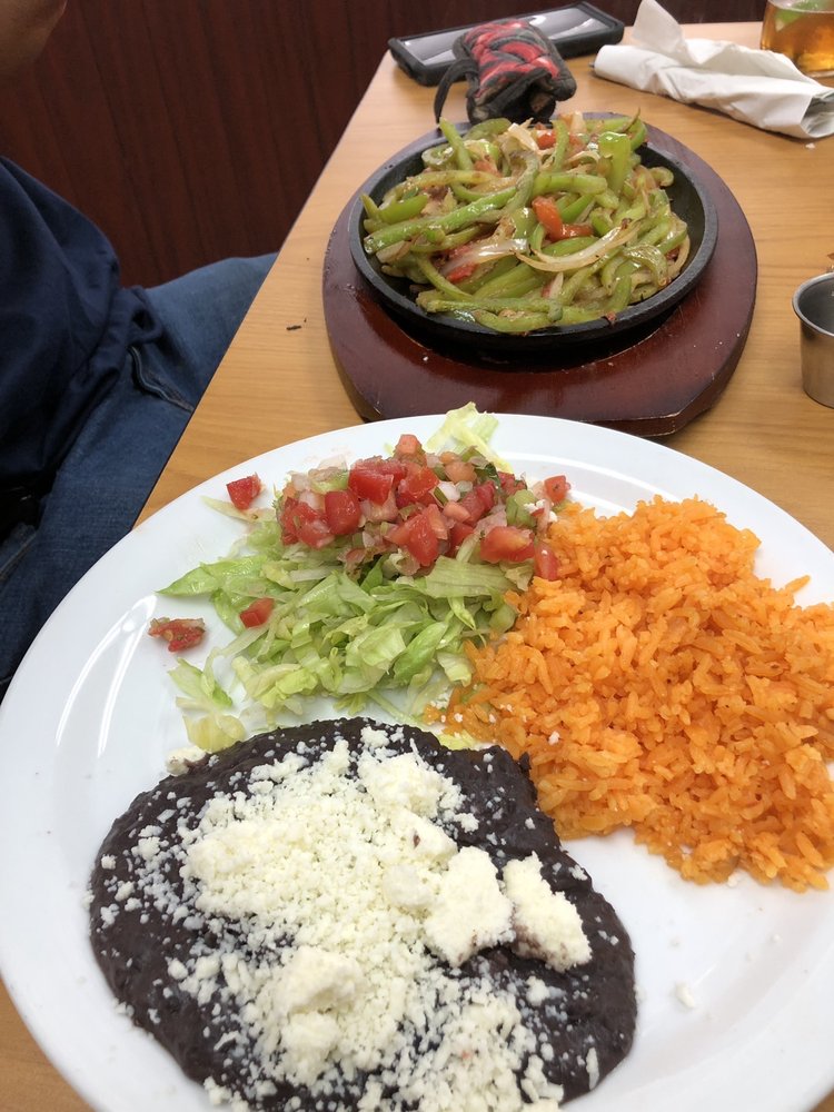 All fajitas are served with peppers, onions, and tomatoes, with a side dish of yellow, white rice, beans, salad with pico de gallo, sour cream, and homemade tortillas.
